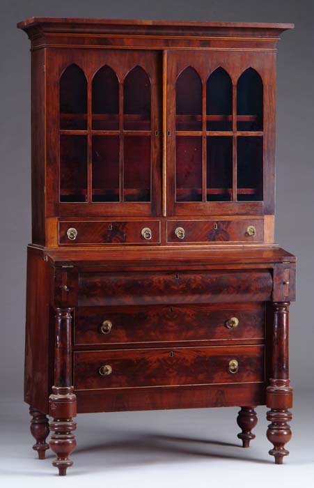 MAHOGANY SHERATON BOOKCASE TOP SECRETARY. The top section having two doors with cathedral window shaped panes behind which are two shelves, below the bottom shelf is an inside drawer with two cubby holes. Below the doors are two drawers with ring holes. The bottom section having a fold-over writing section and three long drawers. Two boldly turned full side columns end in large turned feet. Having tacked labels from “Alfred Hamilton of Prospect Harbor, Maine”. Circa 1820. PROVENANCE: From a fine Millbridge, Maine estate. SIZE: 71” high x 44-1/4” at widest x 13-1/2 deepest. CONDITION: Very good. 9-72192 (800-1,200)