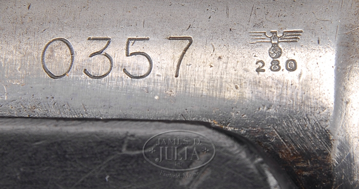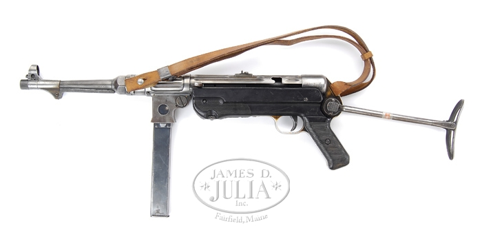 **GERMAN SCHMEISSER MODEL MP38 SUB MACHINE GUN BY ERMA. SN 0357. Cal. 9mm. The MP38 was the first developed sub machine gun developed for the German army since the MP18I of WWI. The MP38 was made from 1938-1940 at the Erma plant. All numbers appear to be matching. Threaded muzzle protector. Drift windage adjustable hooded front sight. Two position notch rear sight w/ 100 meter and 200 meter settings. Heat transfer bar on the bbl. Deep fluted receiver. Black plastic receiver housing w/ black plastic grips. Milled main spring tube. Wire skeletal under-folding stock. Nazi national eagle proof on several parts. Tan leather sling, and 32-rnd magazine also included. PROVENANCE: Stern Collection. CONDITION: Fine. Although very little of the orig. finish is retained by the exposed metal, the uniqueness and rarity of the heavy finned receiver and 3-digit SN easily compensate for it. The full auto only, open bolt mechanism functions smoothly and flawlessly by hand. Rear sights move w/ little effort. Rear stock folds and locks easily. Plastic receiver housing and pistol grips display normal rack and handling wear. Bore although lightly pitted retains deep rifling. 4-34668 JZ26 (25,000-35,000)