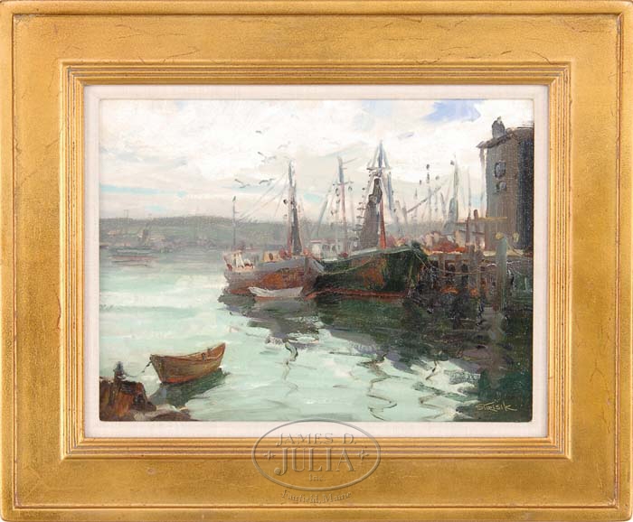 PAUL STRISIK (American, 1918-1998) “GLOUCESTER HARBOR”. Oil on board scene shows two fishing boats side by side tethered to dock with building. Low hills and other boats beyond. Signed lower right “Strisik”. Housed in a gilt molded wood frame with linen liner. Back paper stamped with his Rockport address with title and dated “July 1963”. SIZE: 12” x 16”. CONDITION: Very good. 9-71488 (3,000-5,000)