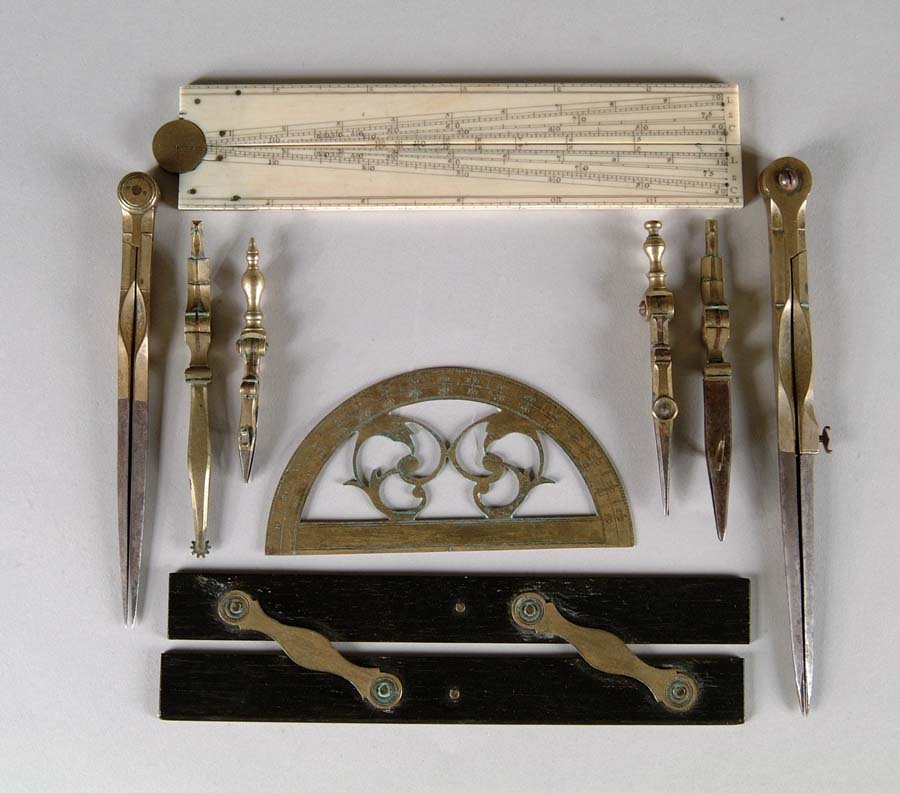 ANTIQUE DRAFTING SET. Wonderful set includes ivory folding rule, pierced brass drafting compass, ebony and brass parallel rule as well as brass and steel protractors and pens all housed in their original case, which is covered in what appears to be shark skin. SIZE: 7” x 2-1/2”. CONDITION: Some damage to compartments within case, otherwise very good. 5-71955 (300-500)