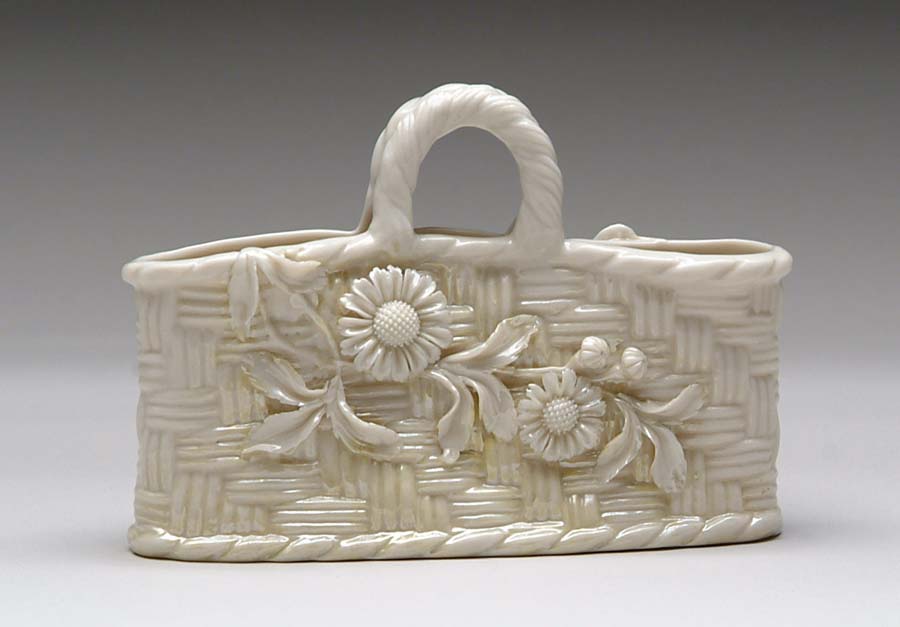 IRISH BELLEEK BASKET VASE. Center handle basket form has two openings for flowers. The basket pattern with applied vine of roses on one side and daisy like flowers on the other. Black mark to bottom. SIZE: 4-1/4” h x 6” l. CONDITION: Very good. 9-25758-4 (150-250)