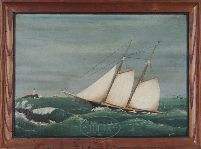 UNSIGNED (American, 19th/20th Century) COASTAL SAILING. Oil on cardboard nautical scene shows two-mast schooner sails right to left in choppy green ocean. A steamship is off the stern and a large sailing ship is off the port bow. Off port bow is a rock island with white and black lighthouse. Unsigned. Housed in an oak modern molded wood frame. SIZE: 15-3/4” x 22”. CONDITION: Very good, craquelure. A nice primitive scene. 9-28252 (800-1200)