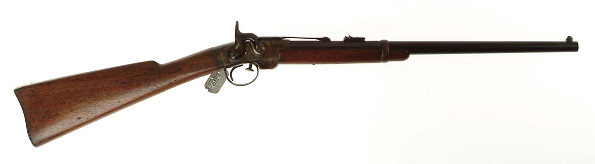 SMITH CIVIL WAR CARBINE. SN 8021. Cal. 50. 21-3/4” part oct bbl. No maker’s name, only the Smith patent and agent markings on the left side of the receiver. The bbl release button has been replaced. The cartouche is unreadable. CONDITION: Brown patina with surface rust mixed with dirt and grime. There is blue visible on the bbl catch and some case hardening in protected areas under the coating. Wood shows handling marks.. Mechanically good. 4-54552 X162 (2,000-3,000)