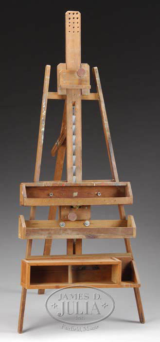 WOOD ARTIST EASEL. Folding easel having three paint trays, one of which is an addition. Adjustable easel height. SIZE: 73” h x 26-1/2” at widest. CONDITION: Generally good. 9-73388 (200-400)