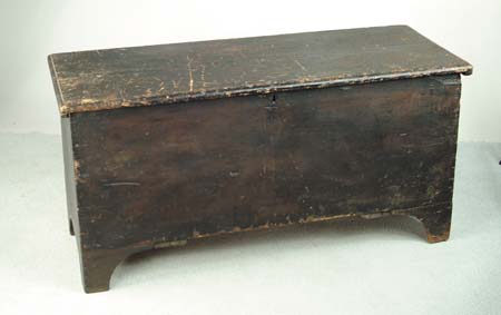 EARLY 19TH OR LATE 18TH CENTURY BOOT JACK BLANKET BOX. Painted black. SIZE: 50″w x 19″d x 25″h. CONDITION: Show’s use. 9-96992 (300-500)