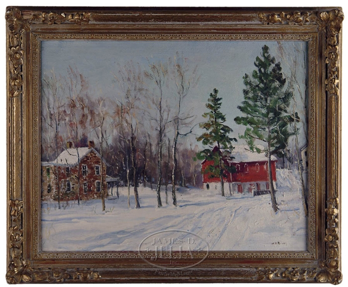 WALTER EMERSON BAUM (American, 1884-1956) PENNSYLVANIA HOMESTEAD. Nice oil on masonite shows a snow covered ground with red and white barn at the end of a snow covered road. Road continues on to a white house on the right and a stone connected house on the left with two chimneys and porch. Signed lower right “WE Baum”. Back of the board has a river and wooded landscape signed “Edgar Baum 43”. Housed in a flower decorated gesso wood frame. SIZE: 16” x 20”. CONDITION: Very good. 9-29389 (7000-10000)
