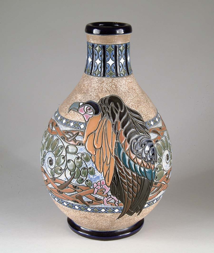 AMPHORA VASE. Very unusual carved Amphora vase has vulture-type bird carved and enameled and surrounded by a stylized carved and enamel band of vegetation and fruit. Neck of the vase has a carved and enameled stylized band, while the lip and foot are finished in a rich cobalt blue. Marked on the underside with a blue oval stamp “Amphora Made In Czecho-Slovakia”. SIZE: 19” t. CONDITION: Very good to excellent. 5-71806 (1,200-1,500)