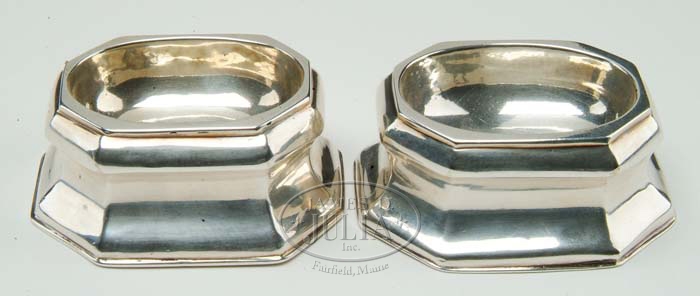 PAIR OF GEORGE I SILVER TRENCHER SALTS. London, 1720-1. Rubbed mark possibly GB or GR. Octagonal plain salts with an oval well. PROVENANCE: Woolworth Collection (FW Woolworth Dept. Store). WEIGHT: 4 tr. oz. SIZE: 1-1/4” h x 3” x 2-1/2” w. CONDITION: Very good. 9-29512 (800-1,200)