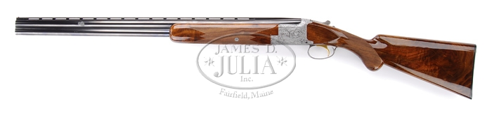 *FABULOUS ROUND KNOB LONG TANG BROWNING DIANA GRADE OVER/UNDER SHOTGUN. SN 35683S5. Cal. 12 gauge. 28″ matted vent rib bbls with single silver sighting bead. 2-3/4″ chambers MOD/FULL choke, ejectors, and single trigger. The characteristic Diana receiver is engraved and signed on both sides, “Vandersmisseng.” left side with four pheasants, bottom with two quail in flight, right with four ducks, and balance of receiver is foliate scroll and two rabbits on trigger guard. Mounted in fancy nicely figured walnut with checkered field style forend, checkered round knob pistol grip with long tang, 14-1/4″ to Browning hard rubber butt plate. Bore diameter: top -.724, bottom -.723. Bore restrictions: top -.037, bottom -.019. Wall thickness: top -.029, bottom -.032. Drop at heel: 2-1/8″. Drop at comb: 1-3/8″. Weight: 7 lbs 12 oz. Housed in Browning luggage case with “Hartman” marked latches. Also with case is Browning booklet, and full guarantee paper. CONDITION: Extremely fine. Gun probably has not been fired since new, but on left side of upper bbl is about a 1/2″ size cleaned spot, and a few minor pinhead sized rust spots. Receiver is crisp and bright with no discolorations. Stocks are sound and have only very slight minor handling marks with clean, crisp, dry checkering. Case is in equally new condition. 4-31655 BDT166 (7,500-10,500)