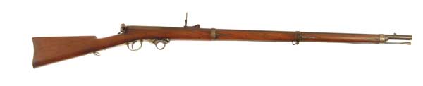 GREENE UNDER HAMMER RIFLE. Cal .54. 36” round bbl marked “GREENE S PATENT / NOV.17 1857.” on the upper tang, no inspector marks are visible. This smoothbore rifle has an oval bore. NSN. CONDITION: Smooth blue brown patina on bbl, mostly brown elsewhere. All other metal has a gray patina with light pitting and spots of surface rust. Wood has dents and scratches with minor chips around the upper tang. 4-49743 X8 (1,2500-2,250)