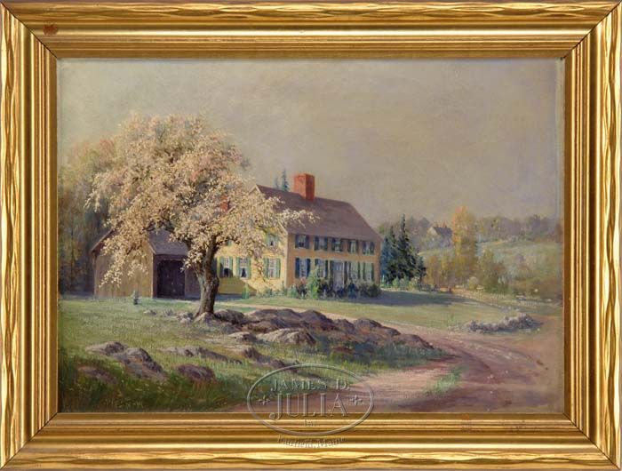 W FRANCIS SNOW (American, 19th/20th Century) NEW ENGLAND HOMESTEAD. Fine oil on canvas New England landscape shows a large yellow saltbox Colonial home having three stories, green shutters and large brick chimneys. A small connected barn is partially hidden by a large blossoming apple tree. The sun cascades light from the left side and there is another home on a hillside in the distance. Signed lower left “W F Snow”. Housed in its original gilt carved wood frame. SIZE: 18” x 25”. CONDITION: Very good with light craquelure and some varnish discoloring. 9-74354 MD (1,000-2,000)