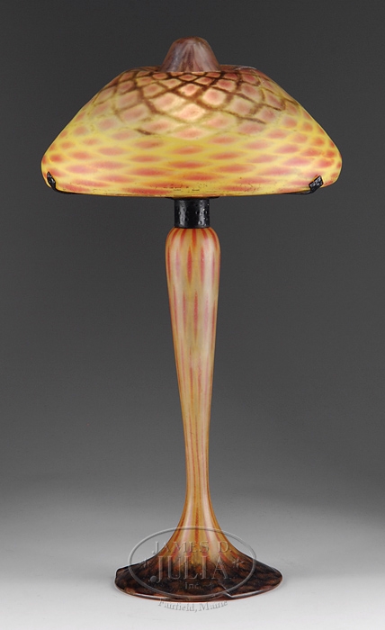 DAUM ART DECO TABLE LAMP. Wonderful Daum Art Deco lamp has internal decoration of diamond design in yellow, pink, mauve and brown against a frosted background. Base has matching decoration that is elongated through the stem of the base. Base is completed with a hand-hammered iron collar and spider. Signed on the side of shade with polished signature “Daum Nancy” with Cross of Lorraine. SIZE: Shade is 10-1/2″ dia. Overall 19″ t. CONDITION: Very good to excellent. 5-66087 (3,000-5,000)