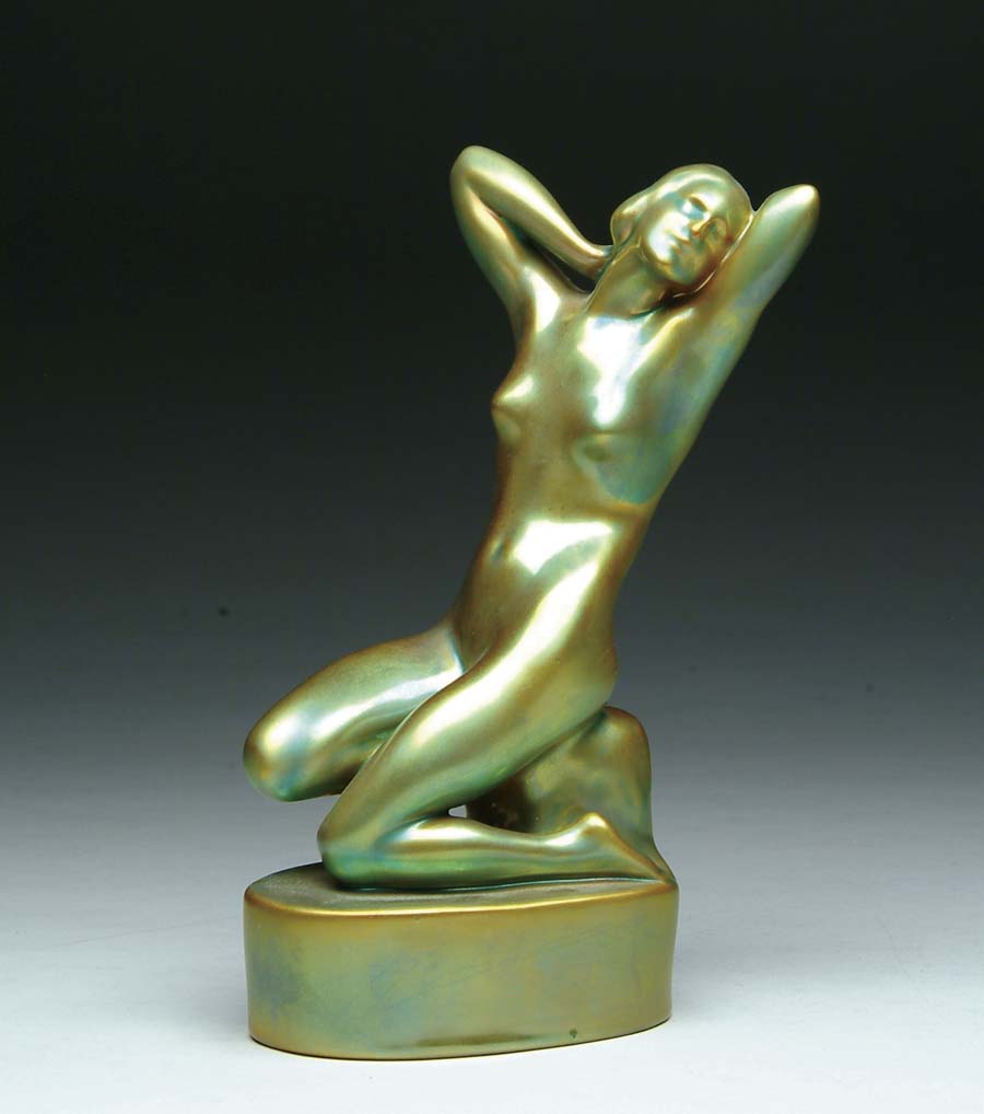 ZSOLNAY NUDE FIGURE. Wonderful Art Nouveau nude figure of a woman kneeling with hands clasped behind her head is done in bright green iridescent glaze with blue highlights. Signed on the bottom with gold five churches mark under glaze and impressed “5”. SIZE: 9 in. t. CONDITION: Very good to excellent. 5-60296 (300-500)
