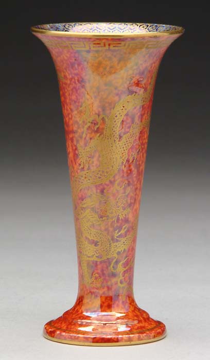 WEDGWOOD DRAGON LUSTRE VASE. Lovely Wedgwood Dragon Lustre vase has gold gilt dragons against a mottled orange lustre background on the exterior. Interior is decorated with a beautiful purple-blue lustre background with a lacy gilt design. Marked on the underside with Portland vase mark, “Wedgwood”, “Made in England” and “Z4825x”. SIZE: 6” t. CONDITION: Very good to excellent. 5-63651 (200-400)