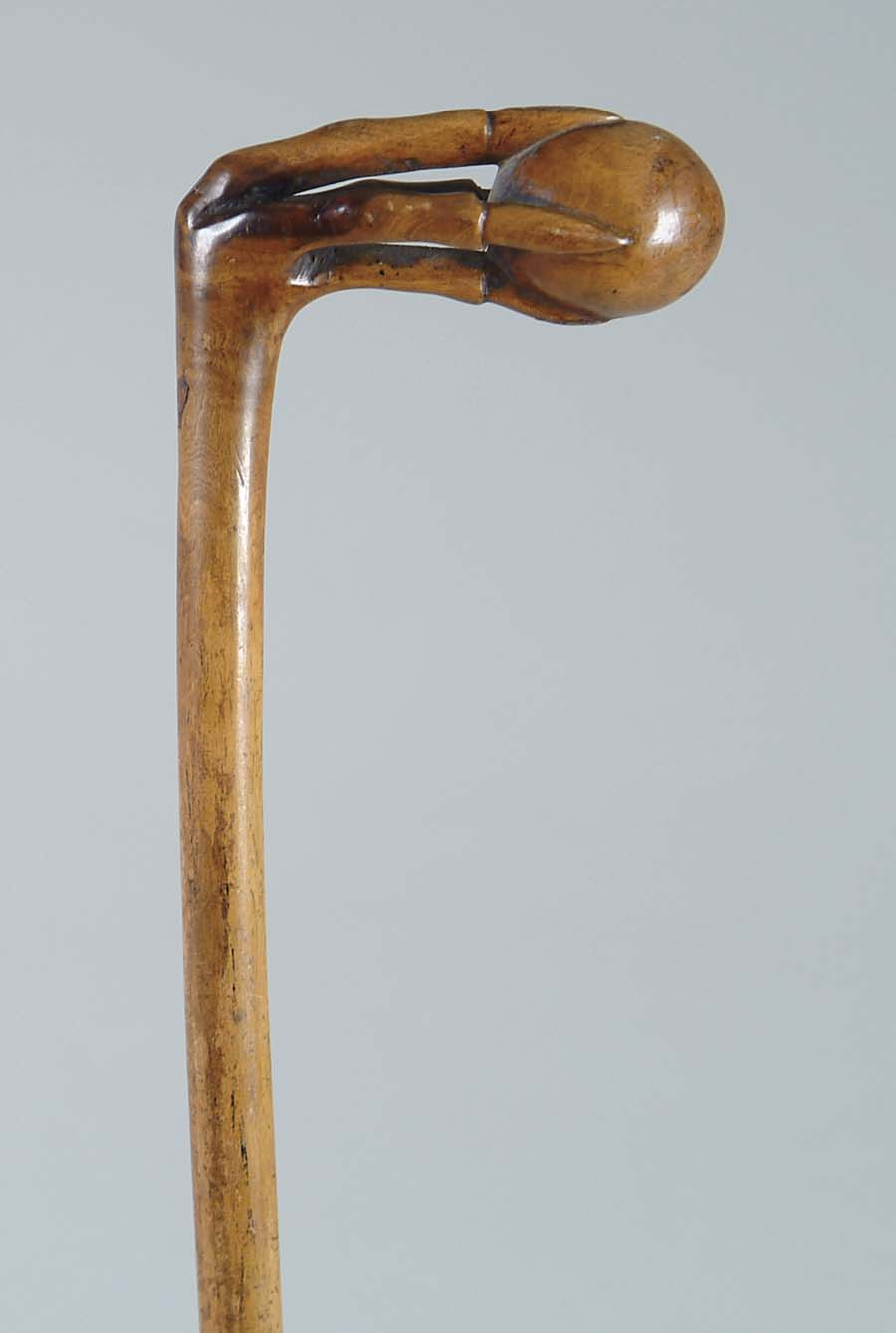 CANE: CARVED WOOD TALON AND BALL CANE. L-shaped wood cane has carved four claw talon holding a round ball form. SIZE: 30-1/2” l. CONDITION: Very good. 9-98043 (200-300)