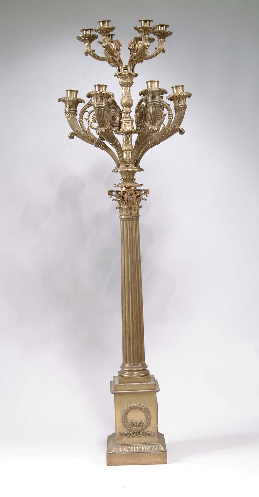 BRONZE FLOOR CANDELABRA. Outstanding floor candelabra is cast bronze with wreath decoration on four sides of the base. A Corinthian column supports a double row of cast bronze candleholders. SIZE: 54” t. CONDITION: Top nut of connecting rod appears to be replacement, otherwise very good to excellent. 5-71878 (2,750-3,250)