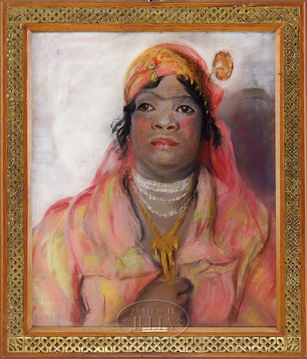 HELEN DAVIDSON (Early 20th Century) ALGERIAN WOMAN. Pastel on canvas half portrait shows a black woman in pink and gold outfit including headdress. She wears decorative silver and gold necklaces. Signed lower left “Helen Davidson Algiers 1925″. Housed in its original carved and partially gilt wood frame. Back retaining a J. Cardin Alger label. SIZE: Sight: 21″ x 17-1/4”. CONDITION: Very good. 9-92775 (800-1,200)