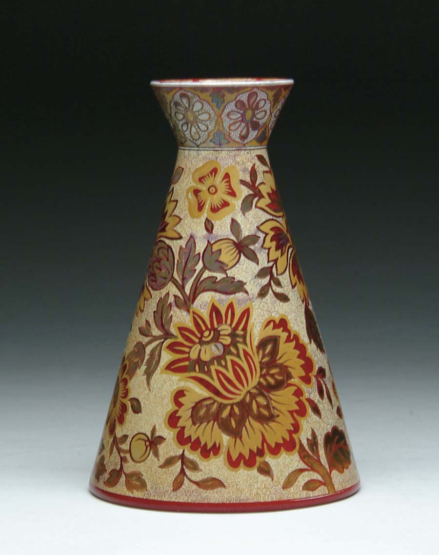 ZSOLNAY DECORATED VASE. Wonderful early Zsolnay vase has allover design of stylized flowers against a background made up of tiny gold swirls. Marked on the bottom with five churches inside a white circle with “Zsolnay Pecs”. Impressed with form number “4019”. SIZE: 7-3/4 in. t. CONDITION: Top of vase has been broken and has amateur restoration. 5-60311 (150-250)