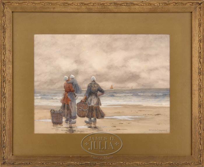 MELBOURNE HAVELOCK HARDWICK (American, 1857-1916) WAITING FOR THE FISHING FLEET. Fine watercolor scene shows a beach with two women and small child with empty baskets. They look out over the ocean with three ships returning from fishing. Signed lower right. Housed in its period decorated gilt frame with gilt wide matte. SIGHT SIZE: 17” x 23”. CONDITION: Very good. 9-74703 (1,500-2,500)