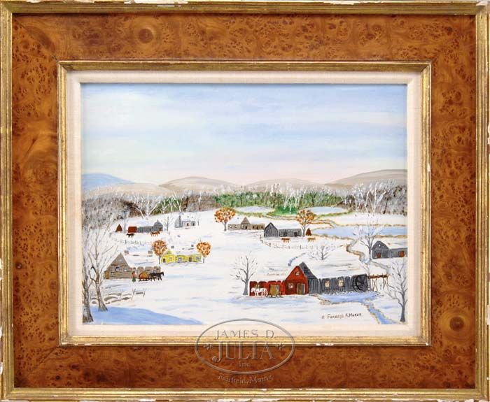 FORREST KING MOSES (American, 1893-1974) “THREE PONDS”. Oil on masonite primitive scene shows a group of Colonial houses in the winter having a mill and three connected ponds. Rolling hills under blue sky. Signed lower right “Forrest K. Moses”. Also an artist label on reverse with title, date of painting “Jan 1963”. Forrest is the son of noted artist Grandma Moses (Anna Mary Robertson Moses). Housed in a burl wood style and gilt wood frame. SIZE: 12” x 16”. CONDITION: Very good. 9-73503 SM (1,200-1,500)