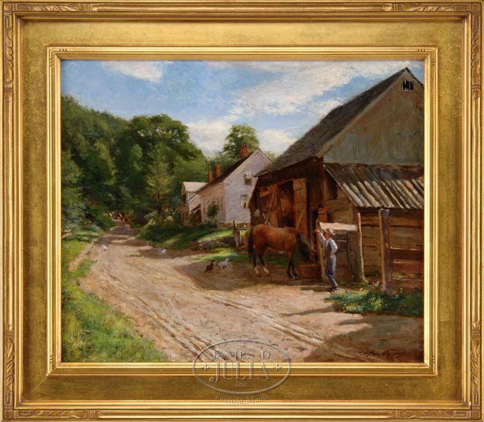 ABBOTT FULLER GRAVES (American 1859-1936) TENDING TO CHORES. Oil on canvas scene shows a connected New England colonial farmhouse with separate barn on a side of a dirt road leading to a bridge under tall trees. The barn doors are open and a horse is seen eating from a trough with a farmer standing beside. Several chickens are on and near the dirt road. The summer scene is shown under a blue and white cloud sky. Signed lower right “Abbott Graves”. Housed in a modern gilt wood carved frame. SIZE: 20” x 24”. CONDITION: Relined. Some inpainting. Very good. 9-90139 HP (15,000-20,000)