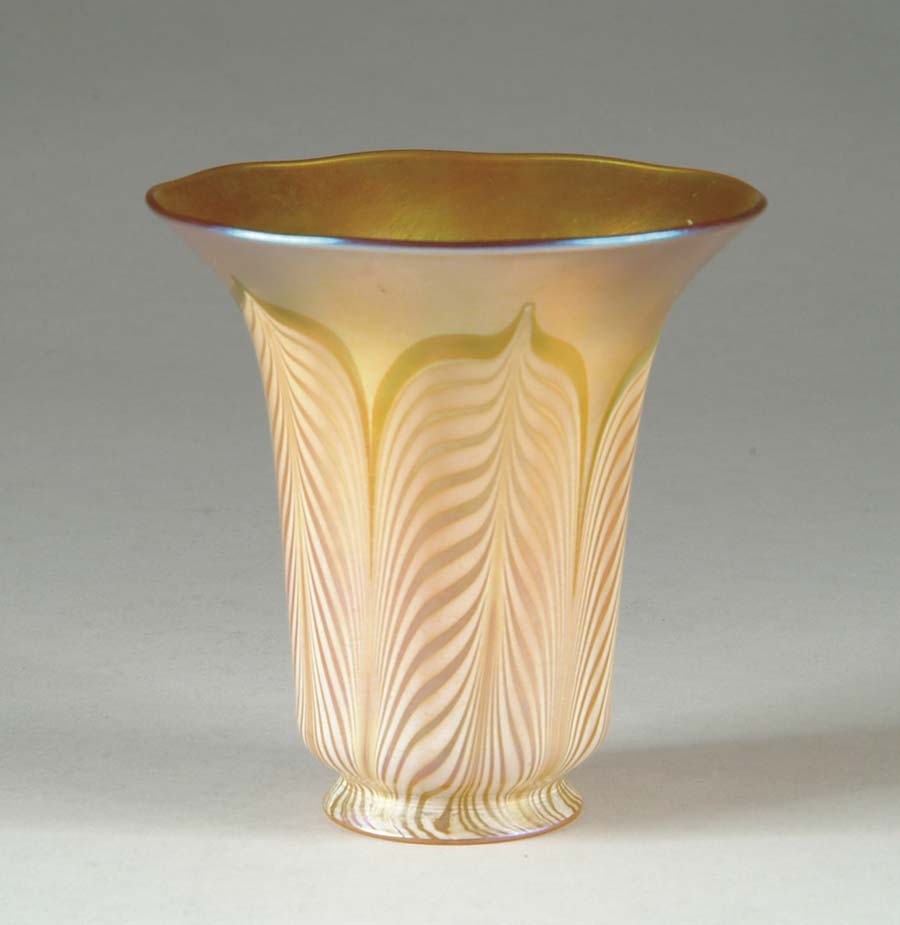 LUSTRE ART DECORATED SHADE. White pulled feather decoration on gold. Trumpet shaped. Signed “Lustre Art”. SIZE: 2-1/4” fitter, 5″ t. CONDITION: Very good to excellent. 5-71247 (250-500)