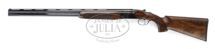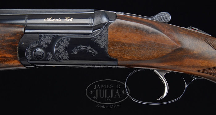 *GRIFFIN & HOWE BY ANTONIO ZOLI OVER/UNDER GAME GUN. SN 236120. Cal. 20 gauge. 29-1/2″ bbls with matted, tapered vent rib with silver center and white Bradley front sighting beads. 3″ chambers, SC chokes, ejectors, and single selective trigger. Left side of bbl inlaid in gold, “Antonio Zoli.” Receiver has moderate foliate arabesque scroll with stippled background with, “Griffin & Howe” inlaid in gold on bottom, with their signature ram head logo. Also, trigger plate is engraved with a drawn bow and, “Zoli” engraved as the arrow. Mounted in fancy walnut with checkered field style forend, checkered pistol grip with 14-5/8″ over thin solid black recoil pad marked, “Zoli.” (Should be noted the trigger is adjustable for length of pull) Bore diameter: top -.622, bottom -.621. Bore restrictions: top -SC, bottom -SC. Wall thickness: top -.033, bottom -.035. Drop at heel: 1-7/8″. Drop at comb: 1-3/8″. Weight: 7 lbs 5 oz. Accompanied with blue plastic hard case with dark blue lining, owners manual, and additional accessory choke tube. Top of lid is stenciled with, “Zoli.” CONDITION: Extremely fine. Shows to be test fired only, and has only a few light handling marks. Should be noted this gun is consecutively serial numbered to the other Griffin Zoli. 4-32134 BDT201 (2,000-3,000)