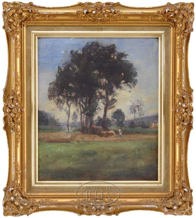 EDWARD MITCHELL BANNISTER (American 1828-1901) TILLING THE FIELD. Oil on canvas backed by cardboard of New England farm scene shows a man behind a pair of steer with harrow all under large trees and blue sky. Most likely a scene from Rhode Island or Massachusetts. Signed lower left. Housed in a fancy gilt period frame with gold liner. REFERENCE: According to Who’s Who “Bannister was among the earliest Rhode Island landscape painters and the first African-American artist to win National recognition”. SIZE: 13” x 11”. CONDITION: Good. 9-74552 MD (5,000-7,000)