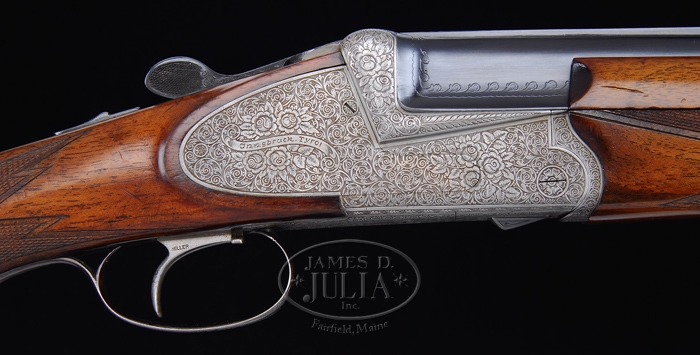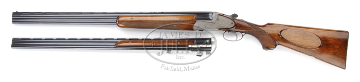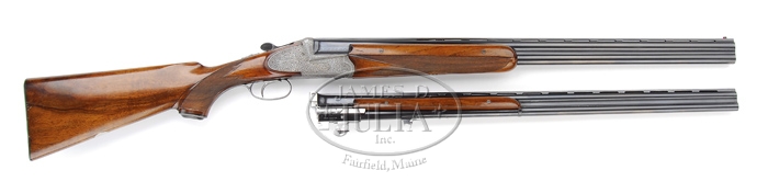 *MAHRBOLDT-PETERLONGO 2-BBL SET OVER/UNDER SHOTGUN. SN 41423. Cal. 20 gauge/.410. 20 gauge bbl: 26″ matted vent rib with red Bradley sighting bead. 3″ chambers, MOD/IMP.MOD chokes, ejectors, and Miller single trigger. 410 bbl: 26″ vent rib with single white sighting bead, 3″ chambers, IMP.CYL/IMP.CYL chokes, and ejectors. Both bbls are Bohler-Spezial-Spahl. The Merkel style reinforced action with side plates, is fully engraved in a floral and foliate scroll pattern with shaded background, and has a banner engraved, “Mahrboldt-Peterlongo” on each side. Mounted with semi fancy walnut with checkered 3-pc forend, checkered pistol grip with horn grip cap with blank initial oval. Left side oval cheek piece, 14-1/2″ over serrated horn butt plate. Toe line has blank gold initial oval. 20 gauge: Bore diameter: top -.622, bottom -.621. Bore restrictions: top -.023, bottom -.018. Wall thickness: top -.028, bottom -.036. Drop at heel: 2-1/8″. Drop at comb: 1-3/8″. Weight: 7 lbs. .410 bbl: Bore measurements: N/A. Weight: 7 lbs 5 oz. CONDITION: Extremely fine. Bluing on both bbls are original and in 95-98%, with just some minor light scratches and a few usual dings. Gray receiver is clean and crisp with a little bit of oil darkening. Stocks are sound with usual small nicks and dings, and retains most of it’s orig finish. Checkering is crisp and sharp. Mechanics are sound, and bores are bright and shiny. 4-33790 BDT190 (9,000-12,000)