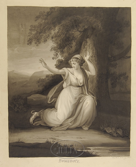 C. A. LUDLOW (American, 19th Century) COLLECTION OF NINETEEN WATERCOLORS. Collection includes three 18-1/2″ x 15″ black and white watercolors titled “Rain”, “Sunshine ” and “Eurydice”. They are all signed and dated with “New York” 1) “July 1805” showing a girl with a dog, 2) “Nov. 1805” showing a girl with a cat and 3) “February 1806″ showing a woman with snake and tree. Also a 15″ x 19-1/2” colored watercolor titled “The Fern Cutters Child” with girl and dog on a hillside. Signed, also New York May 1806. Others include “View Near Limbourg” dated 1802; “View at Newtown Isle of Wight” dated 1802; Unsigned landscape dated 1802; “View Near Southampton” dated 1802; “Hornsey House” dated 1802; Unsigned and undated of a house and landscape; “Orestone Passage Plymouth” dated 1802; “View Near Gloucester” dated 1802; three other landscapes and four portraits of women titled “Tragedy”, “Perdita”, “Meditation” and “Comedy”, all dated 1805. All unframed, housed in a portfolio case. SIZE: Sizes vary. CONDITION: Generally very good. 9-92804 (4,000-6,000)
