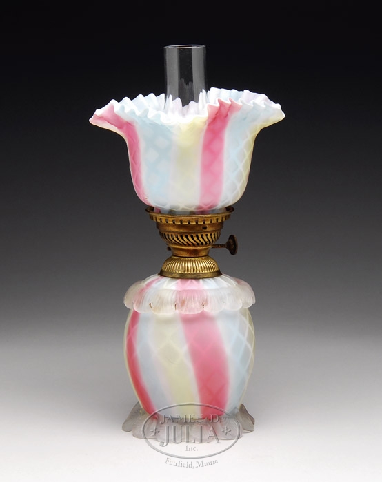 RAINBOW SATIN GLASS MINIATURE LAMP. SI-Fig V left. Gorgeous rainbow colored satin glass lamp with white lining and applied crystal rigaree at top and bottom of base. Foreign burner. SIZE: 9-3/4″ t. CONDITION: Very good to excellent with fitter edge missing white lining. 5-66921 (2,500-3,500)