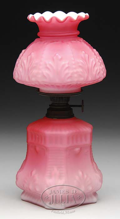 PINK SATIN MINIATURE LAMP. SII-456. Dark pink shading to light satin glass with heavily embossed leaf and ribbing design. Foreign burner. SIZE: 8-3/4″ t. CONDITION: Very good to excellent with minor roughness to fitter edge of shade. 5-67075 (800-1,200)