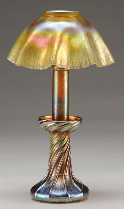 TIFFANY STUDIOS CANDLE LAMP Very pretty Tiffany gold Favrile candle lamp has twisted base with strong blue and red iridescent highlights. Shade has bright gold iridescence with strong pink and green highlights and is finished with a stretched, ruffled rim. Shade rests atop a beautiful Favrile glass riser with candle holder and brass hardware. Shade is signed on the fitter “L.C.T.”. Base is signed on the underside “L.C.T. Favrile”. SIZE: 12-1/2″ t. CONDITION: Very good to excellent. Base has been drilled for electrification, however riser is not electrified. 5-65016 (1,500-2,500)