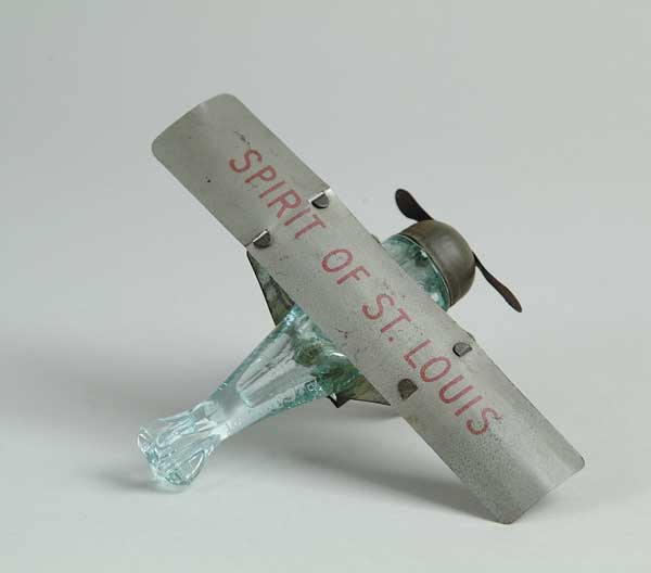 SPIRIT OF ST. LOUIS AIRPLANE CANDY CONTAINER Ca. 1927, Westmoreland Glass Co. Blue tinted glass fuselage with tin wings, landing gear and screw-on nose cap. Top of gray wing lithographed in red with “Spirit of St. Louis”. Right sides marked “W Glass Co Grapeville PA, Net Wt 1/4 Oz.” SIZE: 4-1/2″ l and 6-1/4″ wingspan. CONDITION: Only the slightest of soft bends in the wing where it is attached to the frame, resulting in a small amount of litho loss on the high points, otherwise very good. 1-29919-575 (400-600)