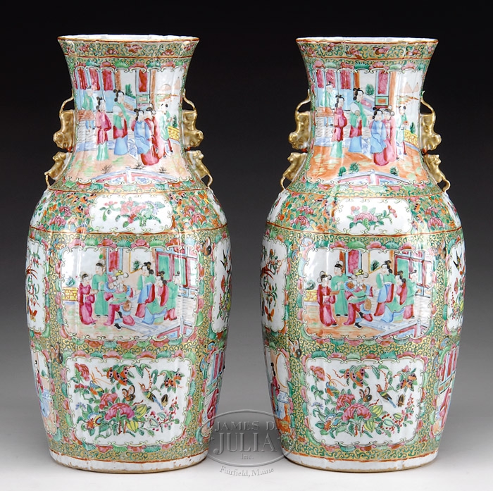 PAIR OF UNUSUAL CHINESE EXPORT ROSE MEDALLION VASES WITH LINEN-FOLD EDGE. Mid-19th century. Each with a linen-fold scalloped rim above a neck applied with gilt foo dog handles, the body with melon-form ribbing, decorated overall with ten panels depicting domestic life alternating with panels of flora and fauna. SIZE: Each 18″ h. CONDITION: Very end of the small tail on one handle has repair, otherwise very good. 9-92727 (3,000-5,000)