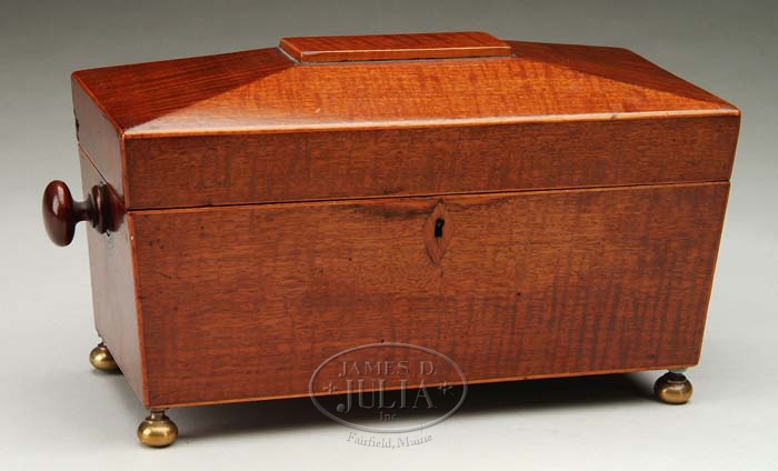 FINE REGENCY CURLY MAHOGANY SARCOPHAGUS SHAPED TEA CADDY. Original turned wood side handles set on original brass turned feet with a three sectioned fitted interior having two lids and fitting for tea bowl. First quarter of the 19th Century. SIZE: 7” h x 13-1/2” with handles x 5-1/2” d. CONDITION: Generally very good, interior lids have repair and small section of tea bowl insert missing. . 9-70661 (500-700)