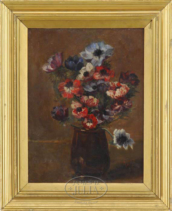 LEON RICHET (French, 1847-1907) VASE OF FLOWERS. Oil on canvas scene of an arrangement of colorful flowers are set in a brown footed pottery vase against a brown background. Signed lower right “Leon Richet, Paris”. Housed in a gold painted molded wood frame with liner. SIZE: 16” x 12”. CONDITION: Very good. 9-73828 (1,500-2,500)