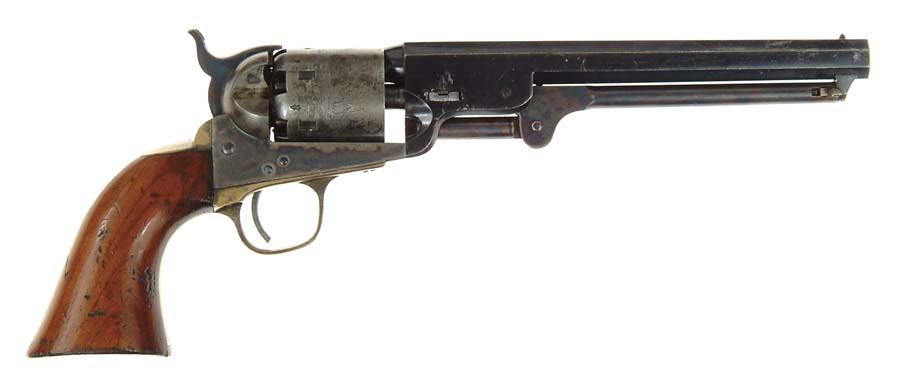 FINE COLT ENGLISH USED NAVY REVOLVER. Cal. 36. SN 188177. Blue & case colored with 7-1/2″ oct bbl with 1-line New York address, pin front sight, unfluted 6-shot cylinder with naval battle scene and silver-plated brass grip frame with large trigger guard and 1-pc walnut grips. There is a small “L” by the serial number in all four locations on the bottom of the revolver. The left side of the grip has a British cartouche marked in the outer circle with crown, the initials “RM” and “ENFIELD”. The inner circle has a small crown with the initials “GS” over an “M”. The bbl & cylinder have British proofs. CONDITION: Very fine plus. Bbl retains 95-96% bright glossy blue with slight muzzle & sharp edge wear. Rammer & lever retain most of their bright case colors. Frame retains about 90% bright case colors on the right side and about 60% faded case colors on the left side. Hammer retains about all of its bright case colors. Cylinder retains about 60% strong blue with the balance a silver/gray patina and still retains about 90% naval battle scene with five of the six safety pins mostly intact. Trigger guard and backstrap retain traces of orig silver-plating. Grips are fine with light nicks & dings and a gouge or two and retain about 95% orig varnish. Mechanics are fine, brilliant shiny bore. 4-54455 JR606 (5,000-8,000)