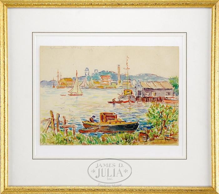 REYNOLDS BEAL (American, 1867-1951) “GLOUCESTER 1948”. Watercolor scene shows Gloucester Harbor with boats, docks and buildings. Unsigned. Pencil inscribed upper left “Gloucester, 1948″. Mounted on white board and housed in gilt modern frame with highlighted white matte. SIZE: 10″ x 14”. CONDITION: Very good. 9-92757 (2,000-2,500)