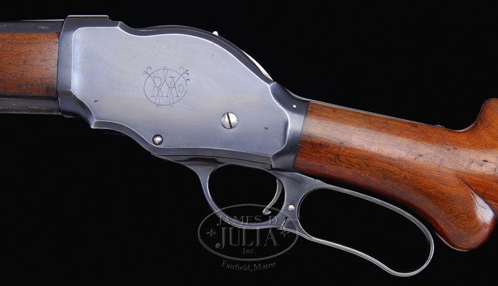 *OUTSTANDING WINCHESTER 1901 LEVER ACTION SHOTGUN. SN 65848. Cal. 10 gauge. 32″ full choked bbl with single brass sighting bead. Usual receiver with scripted “WRA Co.” on left side. Mounted with uncheckered straight grain walnut with round knob pistol grip stock, and checkered steel shotgun buttplate. Bore diameter: .775. Bore restriction: .033. Wall thickness: .038. Drop at heel: 2-1/4″. Drop at comb: 1-7/8″. Weight: 8 lbs 13 oz. CONDITION: Fine plus. Bbl retains 90-95% orig blue with slight muzzle wear, and a few scratches the longest being about 3″, just forward of magazine-tube. Magazine-tube shows wear the first 5″ forward of receiver, and carries silver-patina color there, with balance being a strong orig blue. Receiver has 90-95% orig blue with sharp edge wear, a small lightly cleaned area on left side, and a matching even lighter area on right side. Butt plate is mostly just a silver, mixed with brown/patina color. Stocks are solid with usual nicks and dings, and a couple minor small gouges and retains 70-75% orig varnish, worn through the pistol grip area. Forend pieces are sound with wear through the closest 5″ of the receiver. Mechanics are crisp, and bore has some moderate pitting the first 12″ or so from the chamber. 4-32122 BDT188 (1,500-1,750)