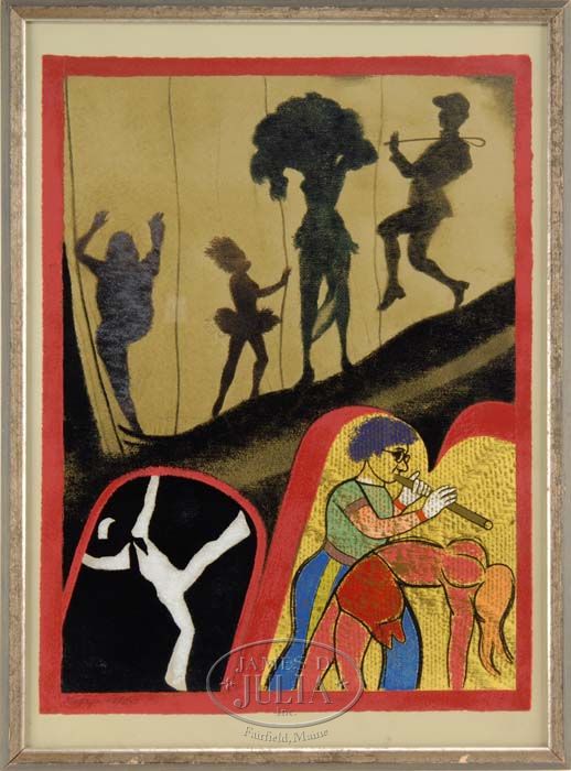 RONALD BROOKS KITAJ (American, 1932-) BURLESQUE. Color silkscreen limited edition shows three vignettes of dancers, one in shadow the other a sailor dancing and another a flute player with dancer. Possible pastel additions which are hard to differentiate from the silkscreen. Signed lower left in pencil “Kitaj 147/250”. Housed in a silver gilt wood frame. SIZE: 29-1/2” x 22”. CONDITION: Very good. 9-90075 SM (1,000-2,000)