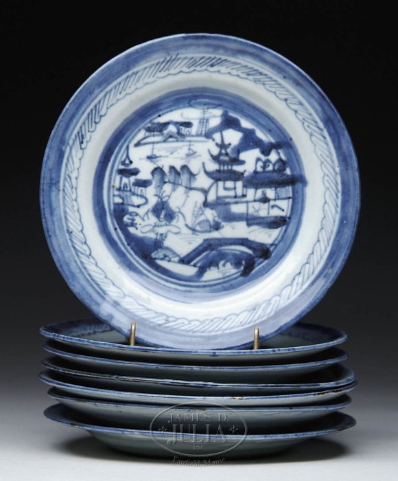 SEVEN BLUE AND WHITE CANTON PLATES. SIZE: 7-1/4”. CONDITION: Six are very good, one has repaired edge. 9-28372 (200-250)