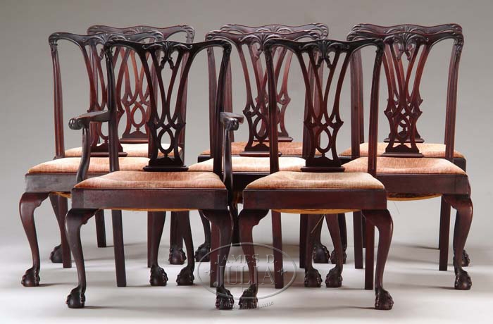 FINE SET OF EIGHT CENTENNIAL BENCH MADE CHIPPENDALE CHAIRS. Philadelphia style chairs have finely carved back crest with pierced splat. Cabriole legs ending in ball and claw feet. Slip type seats, original finish. Set consists of one armchair and seven side chairs. PROVENANCE: From the Turpin-Brewer Estate, Boston, MA. SIZE: 37-3/4” h x 18” seat h. CONDITION: Very good. 9-71690 (6,000-8,000)