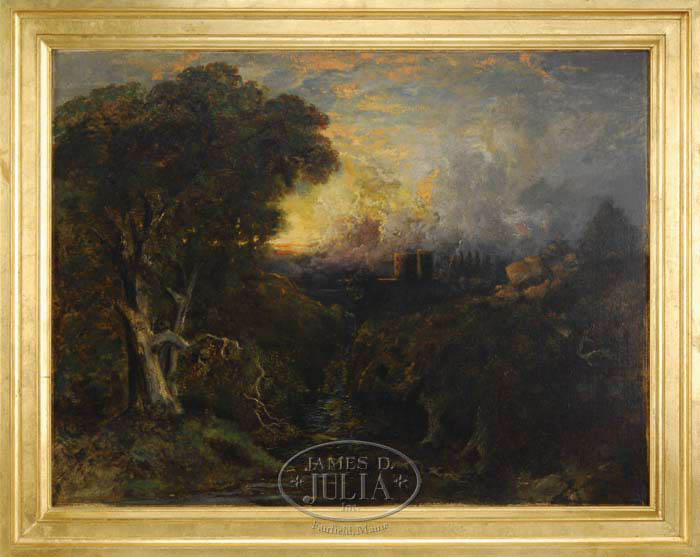 NIEMANN (British, mid 19th Century) CASTLE AT SUNSET. Large oil on canvas scene shows a castle with lake against a sunset sky with small waterfall and river emptying to a foreground pool. A large tree is seen on left side. Signed bottom right “Niemann 1851/2/3”. Possibly the work of Edmund John Niemann. Housed in a modern wide gilt molded wood frame. SIZE: 34” x 44”. CONDITION: Relined, restored with inpainting, otherwise very good. 9-73836 (8,000-10,000)