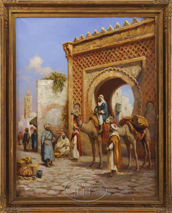 ARTHUR TREVOR HADDON (British, 1864-1941) GREETING THE TRAVELERS. Large oil on canvas scene shows two men with camels arriving on the outskirts of a Middle Eastern city. Several merchants are beside buildings. Signed lower right “Trevor Haddon”. Housed in what appears to be its original carved and gilt wood frame. SIZE: 36-1/4” x 28”. CONDITION: Very good. 9-73820 (4,000-6,000)