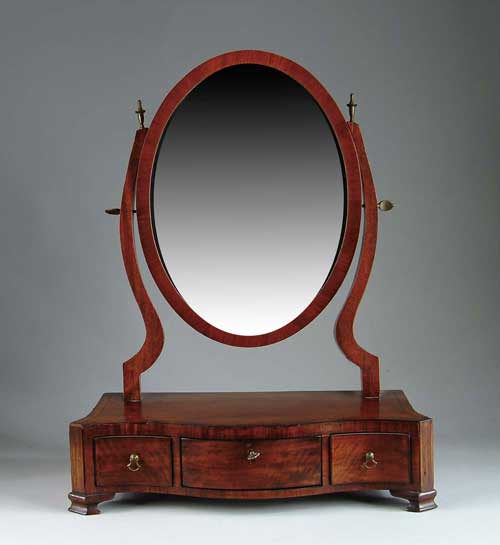 ANTIQUE THREE DRAWER OVAL DRESSING MIRROR. Serpentine front with banded inlay, small bracket feet. Oval mirror supported by shaped supports with small urn brass finials. SIZE: 22” h x 18” w x 8” d. CONDITION: Generally very good. 9-97282 (550-750)