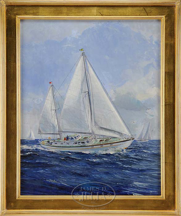 DEAN WAITE (American, 1923-) SUMMER YACHTING. Oil on canvas scene shows a two-mast sailing yacht in full sail sailing left to right in blue ocean with white tipped waves. Two similar boats are seen parallel, possibly racing. Signed lower left. Housed in a fine gilt modern frame. SIZE: Sight: 29-1/2″ x 23-1/2″. CONDITION: Very good, sections flourece under blacklight which may indicate a later finishing. 9-95059 (3,000-5,000)