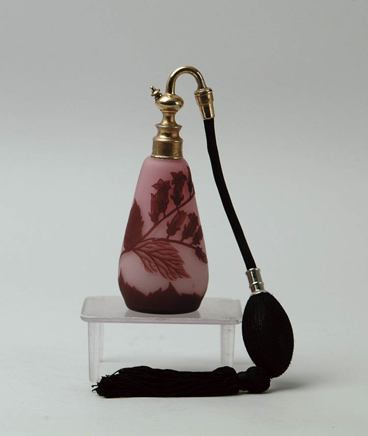 SIGNED RICHARD CAMEO ATOMIZER. Floral decoration in pinks and amethyst. SIZE: 6 1/2″ tall. CONDITION: Very good to excellent. 5-67243 (400-600)