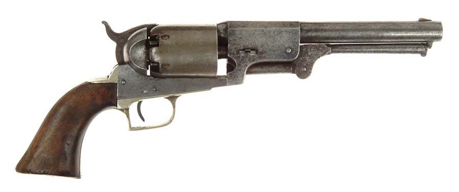 UNKNOWN COPY OF A COLT 1ST MODEL DRAGOON. Cal. 44. NSN. Usual configuration with 7-1/2″ oct to rnd smoothbore bbl, German silver front sight and very unusual German silver grip frame with 1-pc walnut grips. The grip frame is made at an unusual angle and the trigger guard is square backed. The cylinder is a modern day replacement. This revolver is totally unmarked. CONDITION: Good to very good. No finish remains being a mottled silver/gray patina overall with fine surface etching. Grips are sound showing much wear with traces of varnish near the frame. Mechanics are fine. Dark lightly pitted bore. Missing the wedge screw. From the collection of the late Bruce McDowell. 4-54664 JR589 (1,000-2,000)