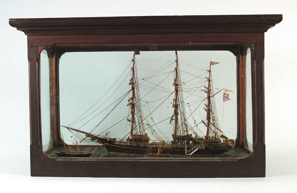 OUTSTANDING CASED WATERLINE MODEL OF THE SHIP “GLADYS”. Three-mast ship flies pennants and flags off mast, fully rigged with no sails. Nice features include woman figurehead, four painted and carved wood people on deck, small steam boat tethered to gang stairway with person, steam and sailor off port bow. Four lifeboats and painted wood sea. At stern of boat there are two life preservers with “Gladys Galveston”. Makers plaque in painted wood in corner “Build. By. F. I. Iensen. U. S. L. S. Station Galveston. Tex.”. Fine carved original case with large cornice molding. Glass top and all sides. SIZE: 20-1/4” h x 33-1/2” w x 16” d. CONDITION: Very good. 9-94180 (3,000-5,000)
